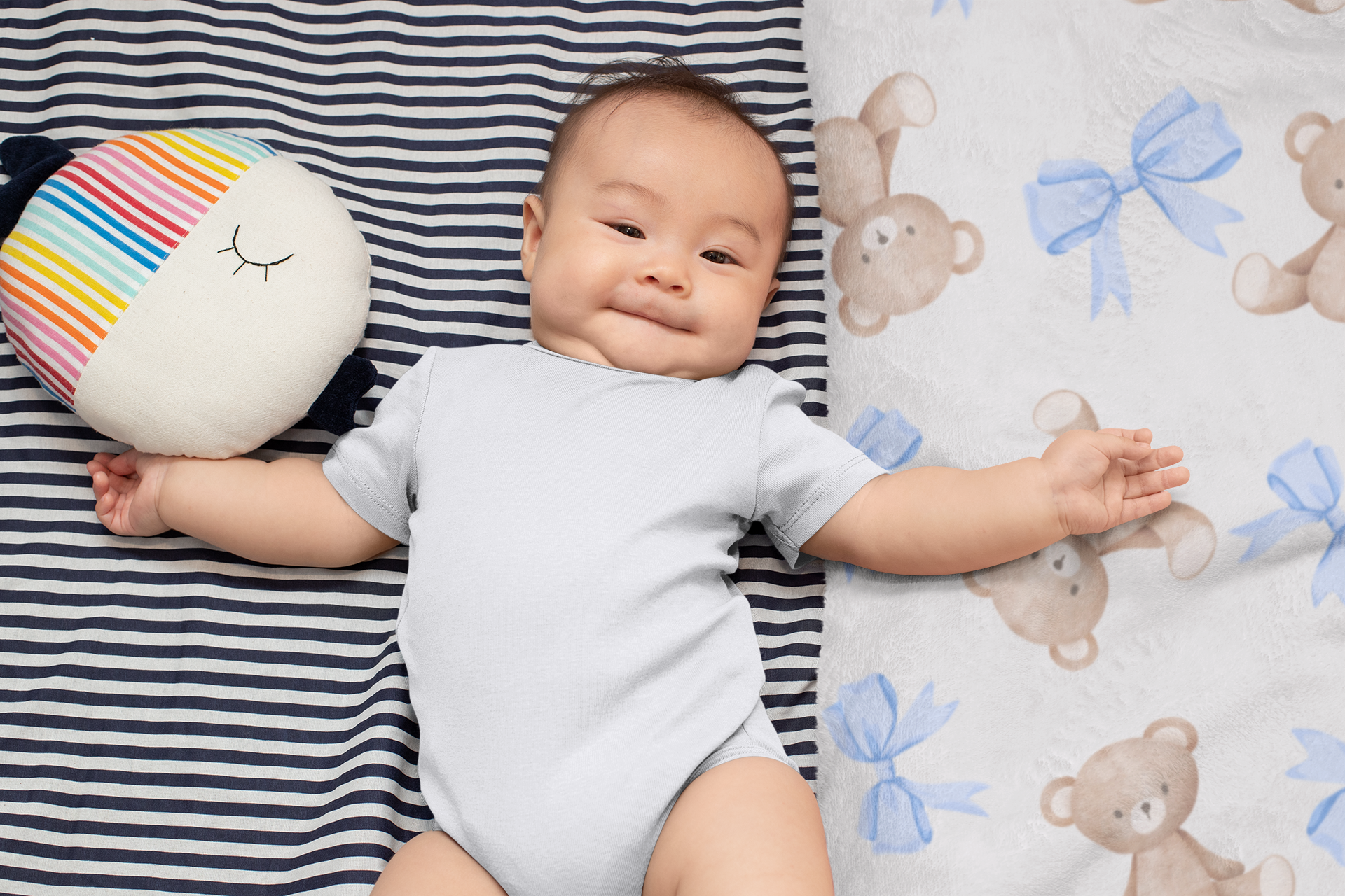 - Vibrant, one-sided printed design of teddy bears and blue bows