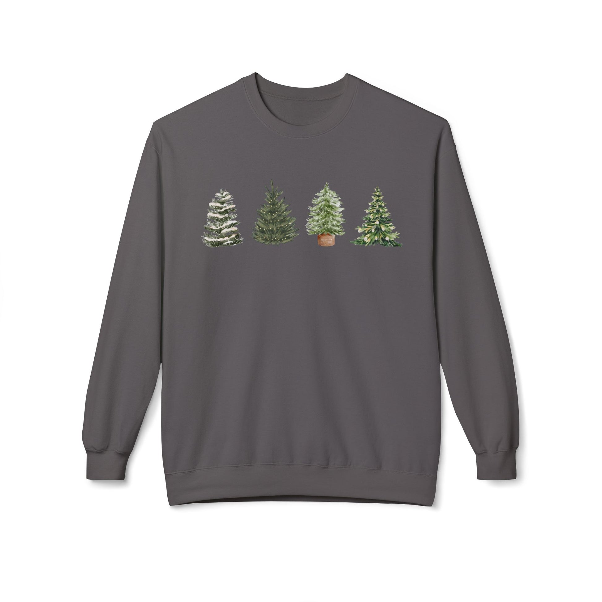 This midweight crewneck sweatshirt brings quiet woodland charm to everyday wear. Four watercolor-style evergreen trees sit across the chest, each with its own shape and personality — from frosted pine to full, homey spruce. The classic fit and slightly dropped shoulders create a relaxed silhouette you can layer over a tee or shirt. Wear it on slow mornings with coffee, on chilly hikes where the air smells like sap and earth, or at low-key gatherings when you want to feel cozy and grounded. The soft ring-spun cotton blend and tubular knit keep the look simple and durable, so the trees feel like a familiar companion through seasons and small adventures.