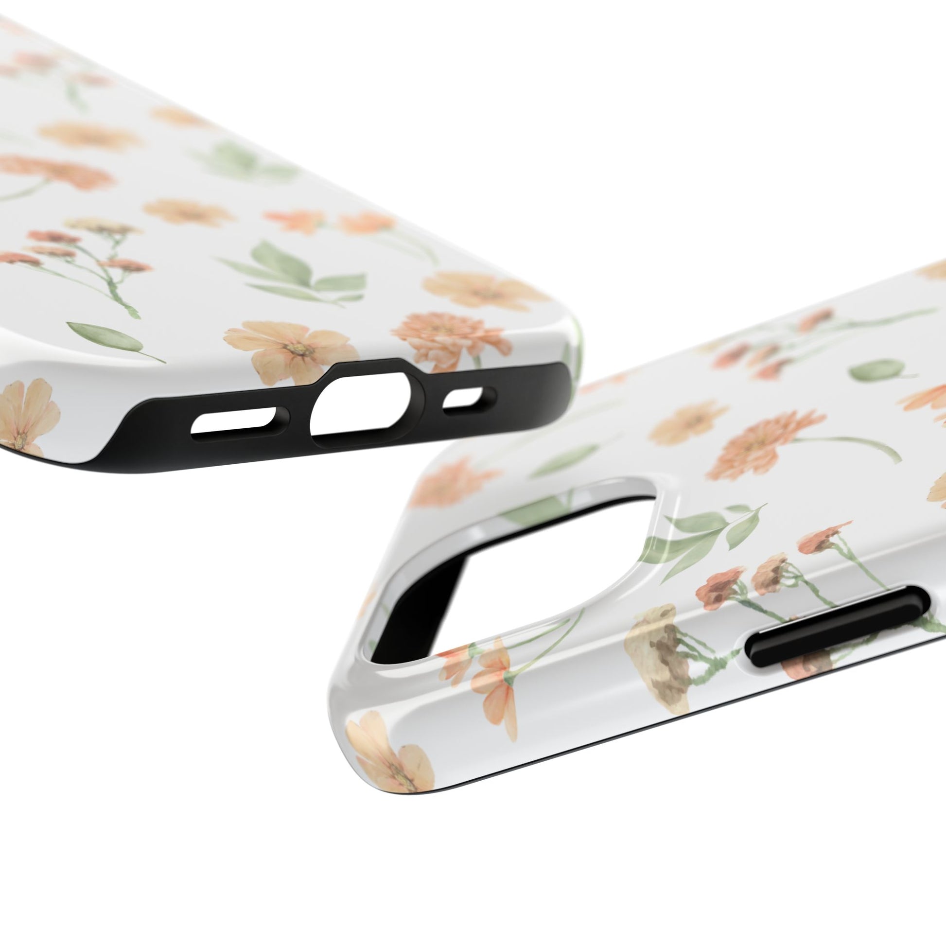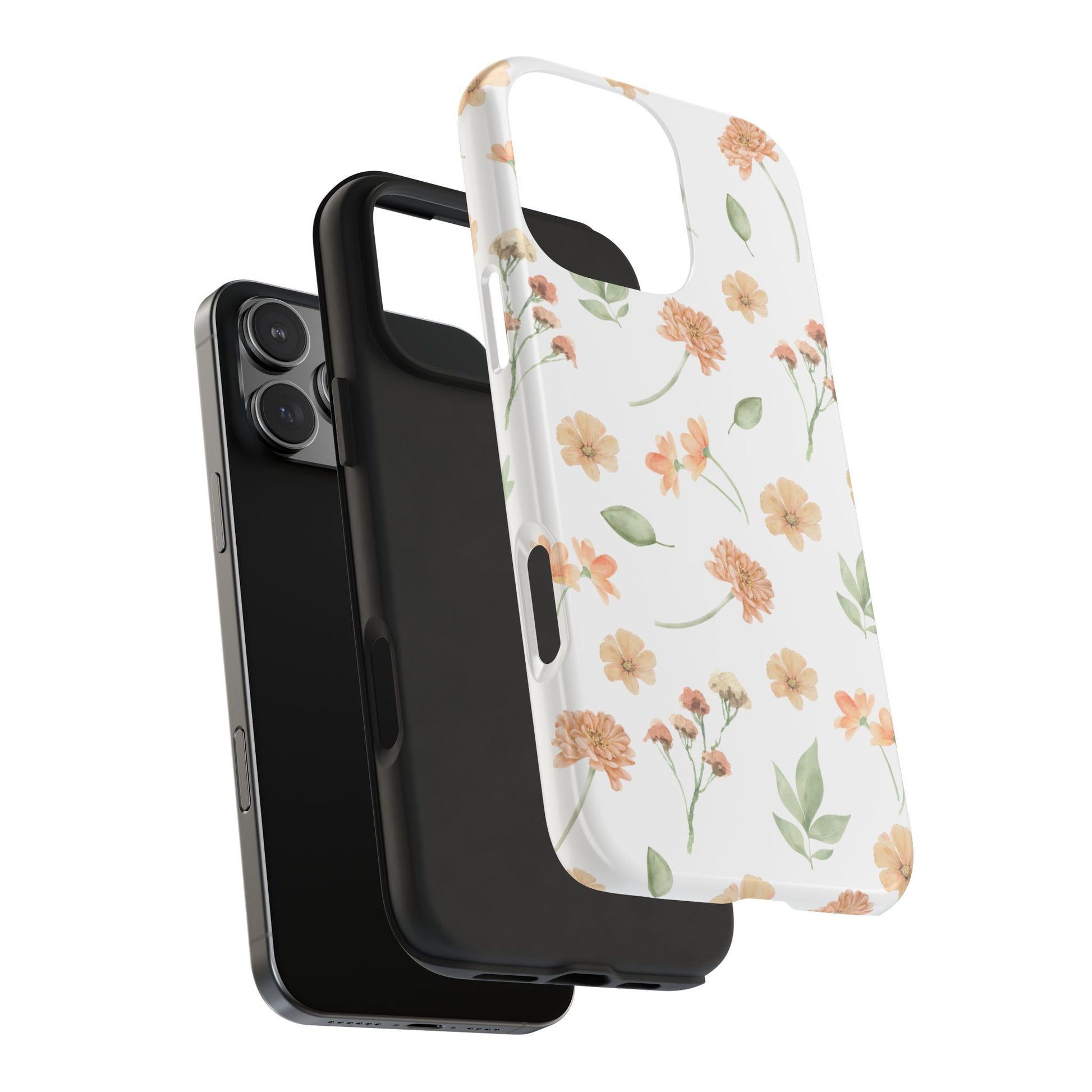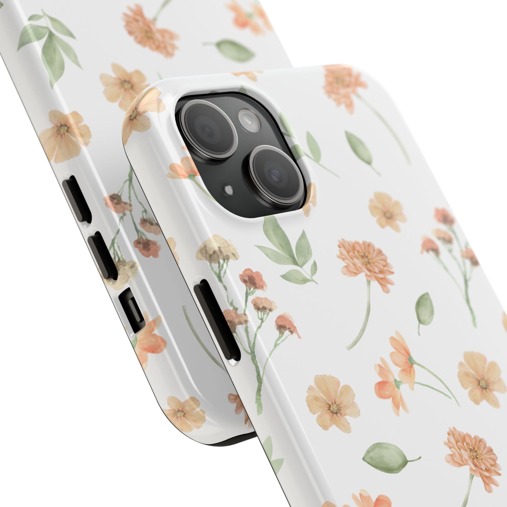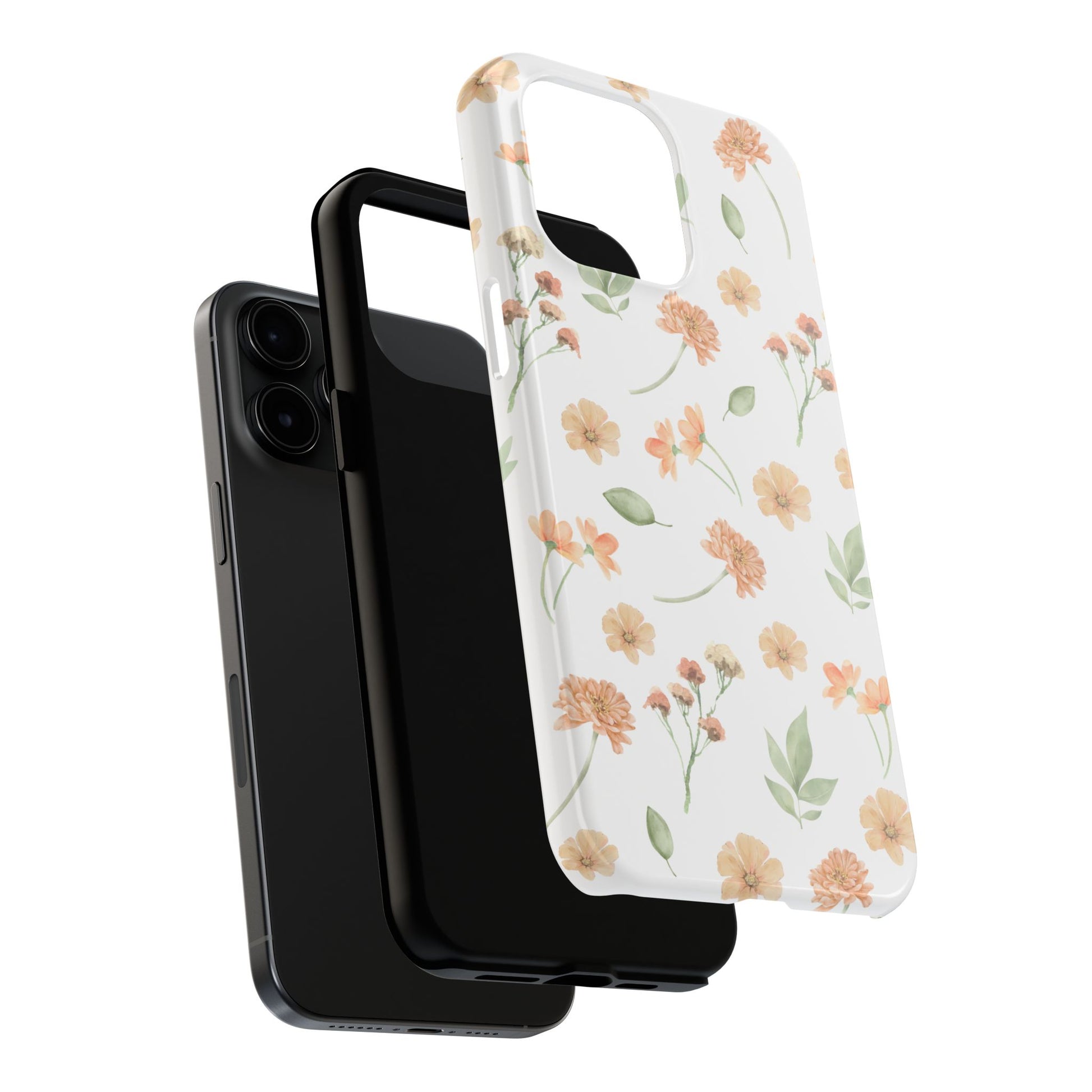 A slim, protective phone case that feels like a little pocket of spring. Soft peach blossoms and loose green leaves float across a clean white background, bringing a calm, organic look to your everyday carry. The case snaps on in two pieces — a rigid outer shell and a cushioned rubber liner — so it resists everyday bumps while the raised bezel keeps the screen off flat surfaces. The glossy finish makes the watercolor-like florals pop, and UV protection helps maintain the colors even after sunny days outdoors. Lightweight and responsive, it lets you charge wirelessly and keeps your phone looking gentle and thoughtfully styled.