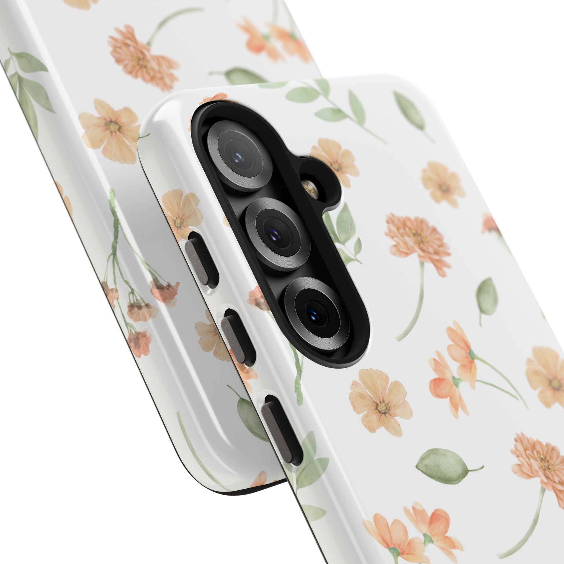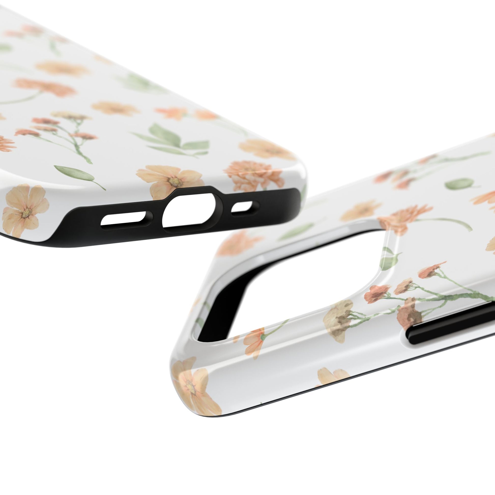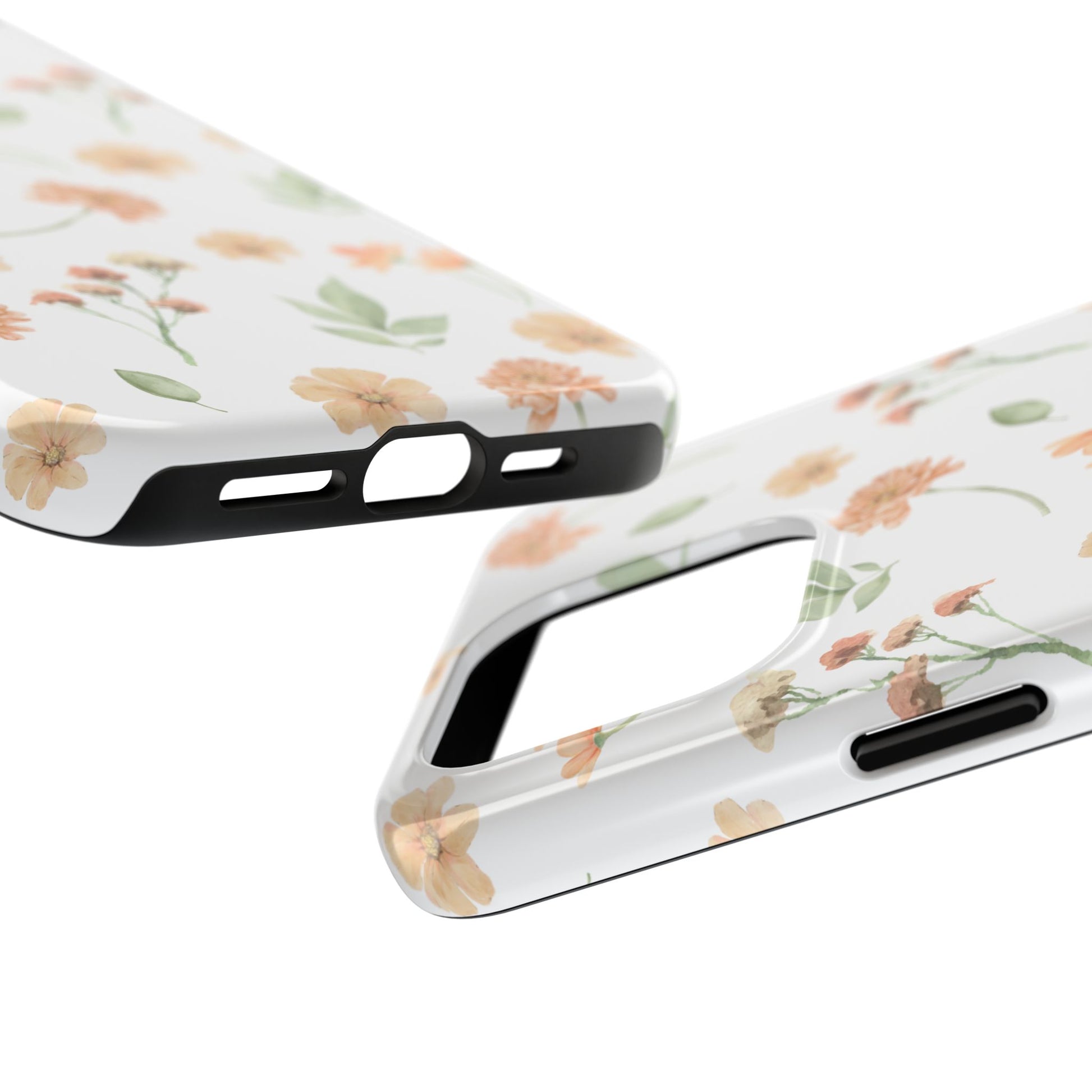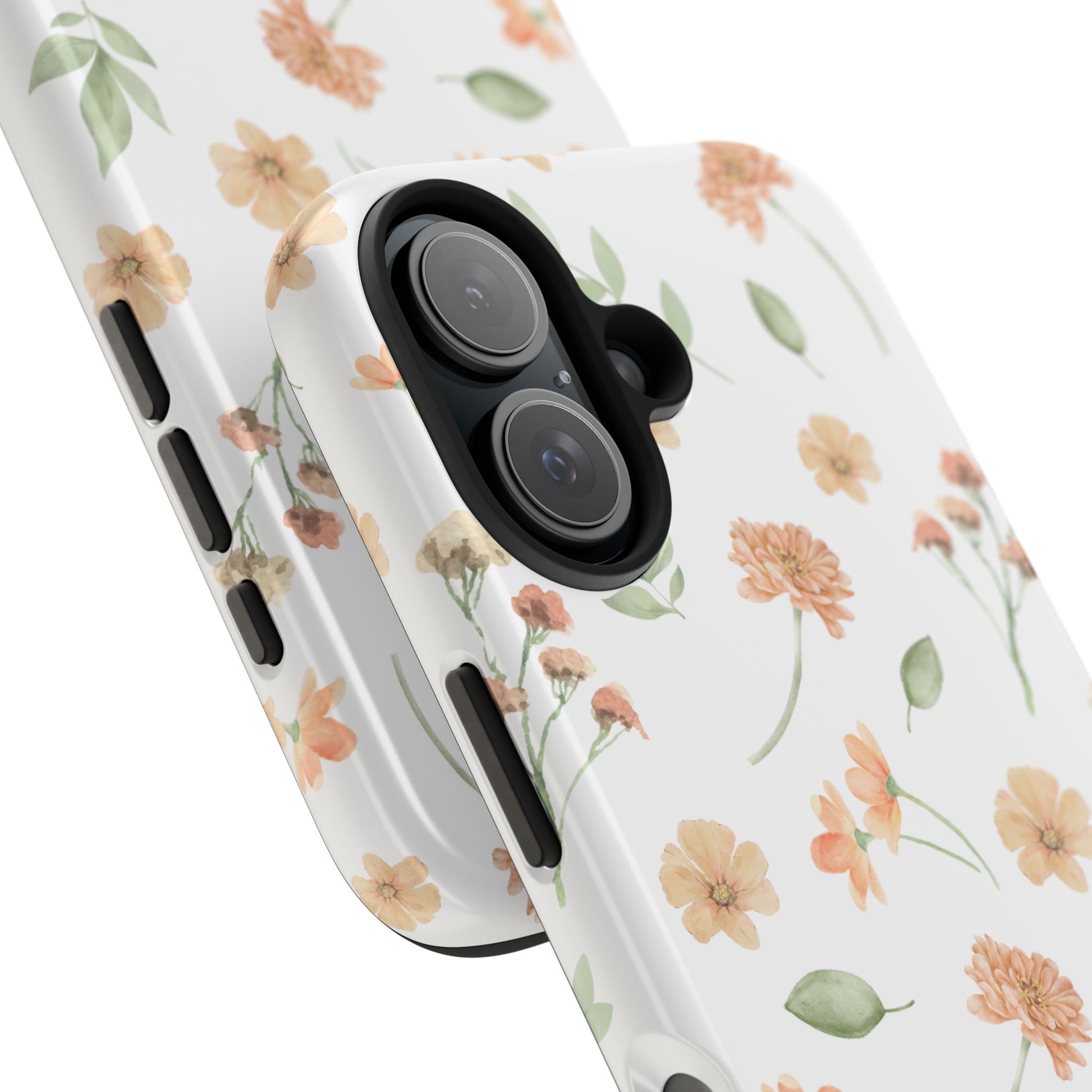 A slim, protective phone case that feels like a little pocket of spring. Soft peach blossoms and loose green leaves float across a clean white background, bringing a calm, organic look to your everyday carry. The case snaps on in two pieces — a rigid outer shell and a cushioned rubber liner — so it resists everyday bumps while the raised bezel keeps the screen off flat surfaces. The glossy finish makes the watercolor-like florals pop, and UV protection helps maintain the colors even after sunny days outdoors. Lightweight and responsive, it lets you charge wirelessly and keeps your phone looking gentle and thoughtfully styled.