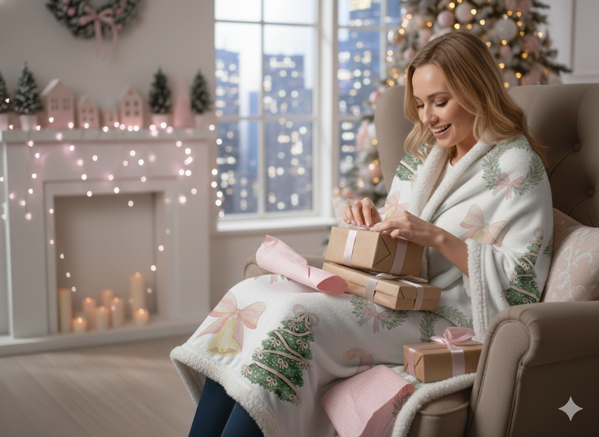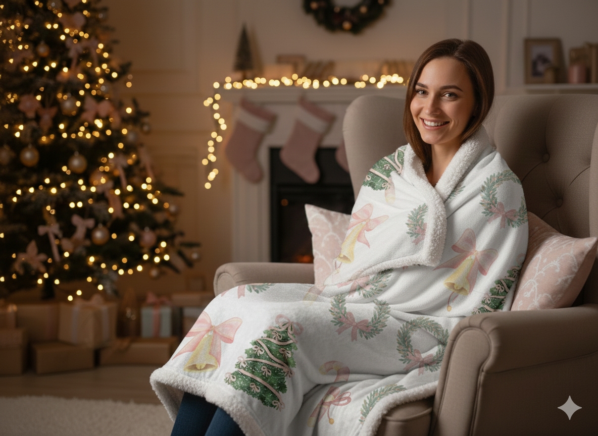 Soft, whisper-quiet snowfall of pastel holiday charm. This sherpa fleece blanket wraps you in a plush, velvety embrace—one side printed with delicate watercolor-style wreaths, candy canes, bells and ribboned trees in soft greens and blush pinks, the reverse a thick, cloud-like sherpa that holds warmth close. Drape it over a sofa during evening movie nights, tuck it around your shoulders while reading by lamplight, or lay it across a bed to add a subtle festive layer that feels handcrafted and calm. The muted palette and gentle motifs bring a quiet, vintage-inspired holiday mood without shouting for attention. It’s the kind of blanket that invites lingering — slow mornings with hot cocoa, cozy chats with a friend, or a peaceful moment alone as winter settles in.