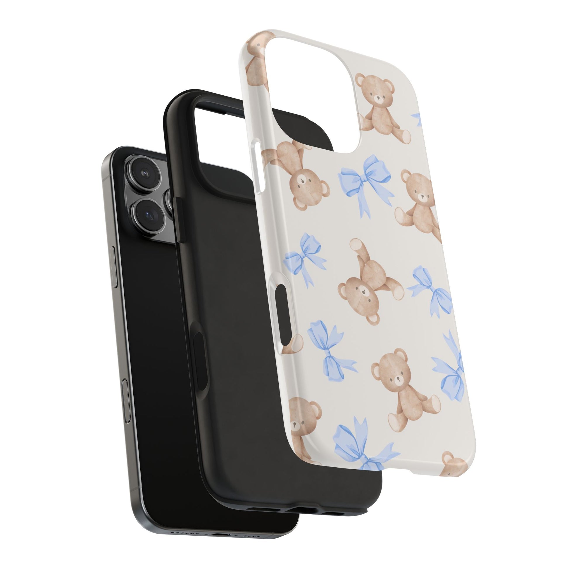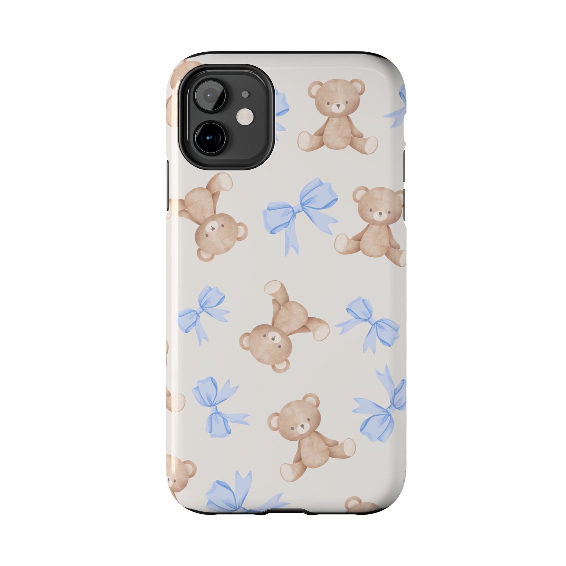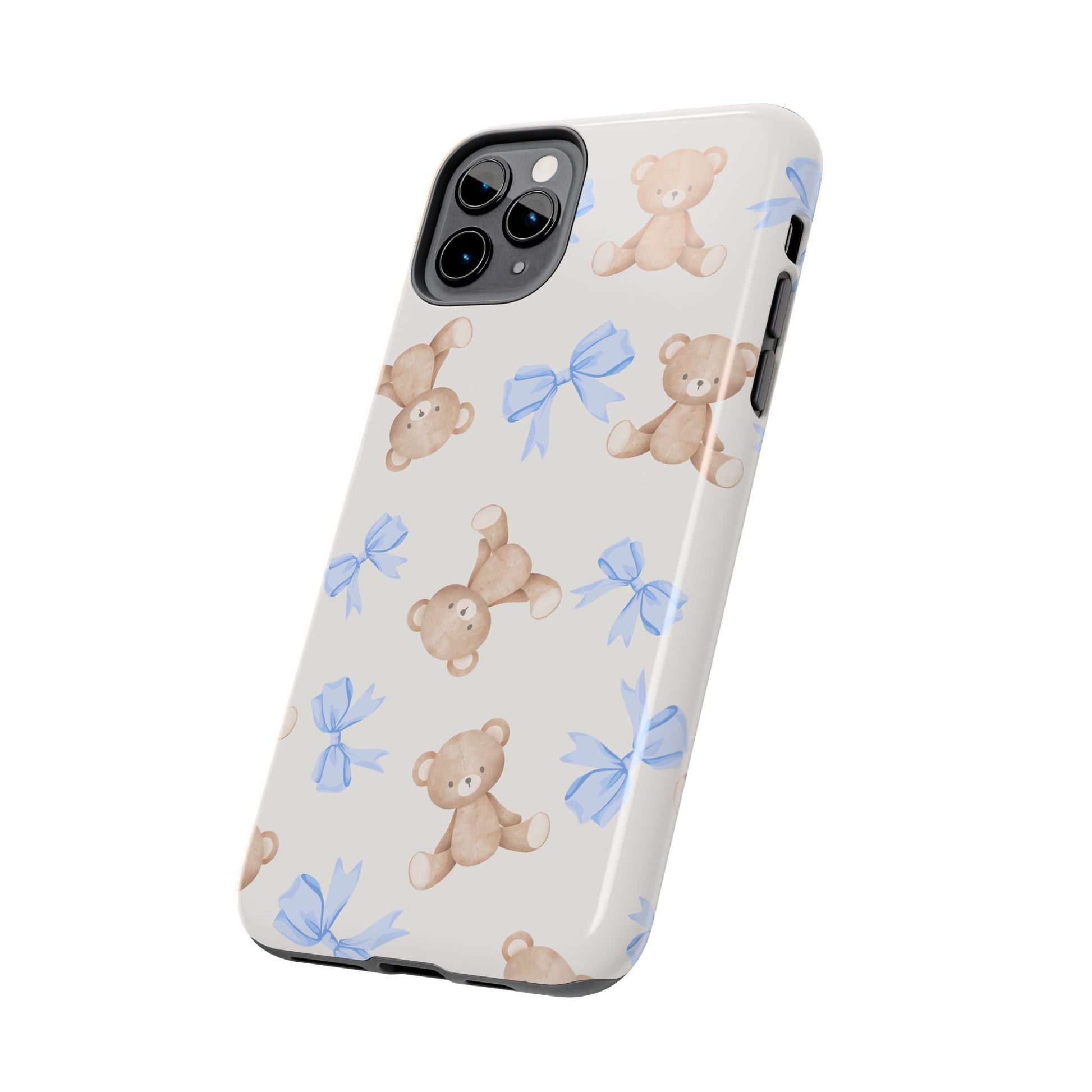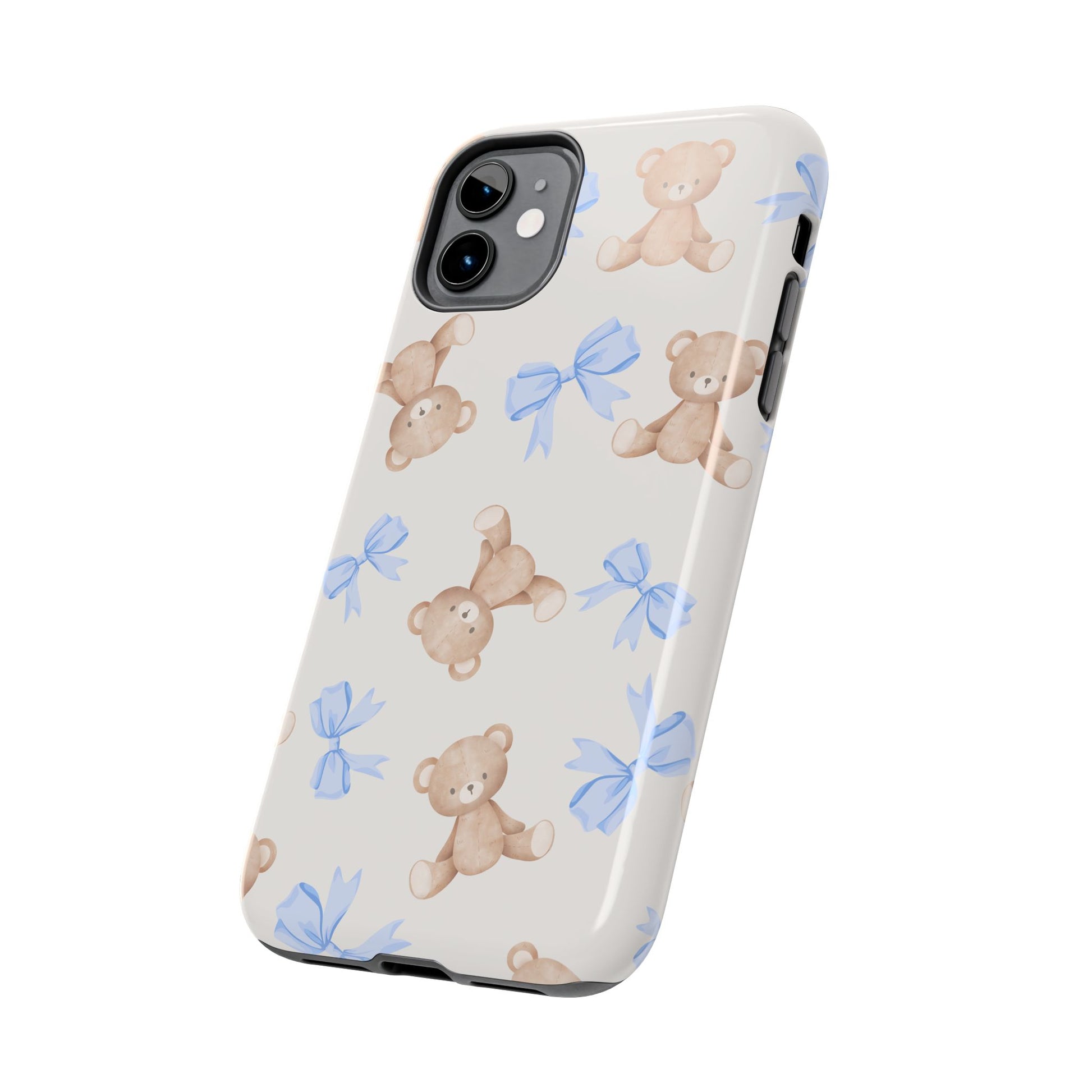 A playful, protective phone case that brings a soft, nostalgic touch to everyday carry. Tiny teddy bears with delicate blue bows parade across a glossy background, turning a practical protective shell into a small keepsake you’ll see every time you reach for your phone. The two-piece construction — a tough polycarbonate outer shell and a flexible TPU inner liner — absorbs shocks and disperses impacts, while the raised bezel helps keep the screen safe from scratches when laid face-down. The glossy, UV-protected finish keeps colors bright over time so the pastel blues and warm browns stay cheerful. It supports wireless charging and fits modern phone models, including the newest iPhone 17 series, so protection and sweet style go hand in hand.