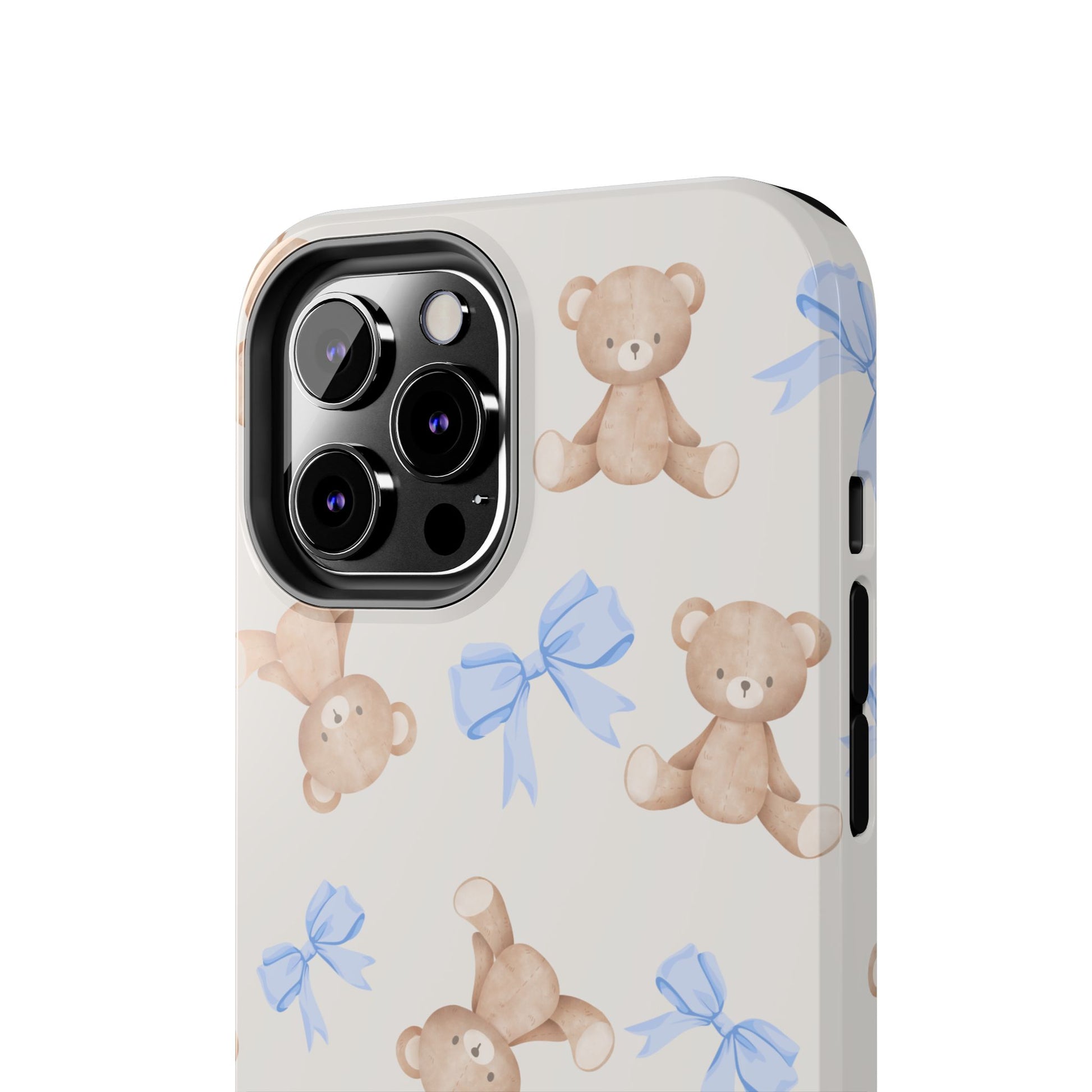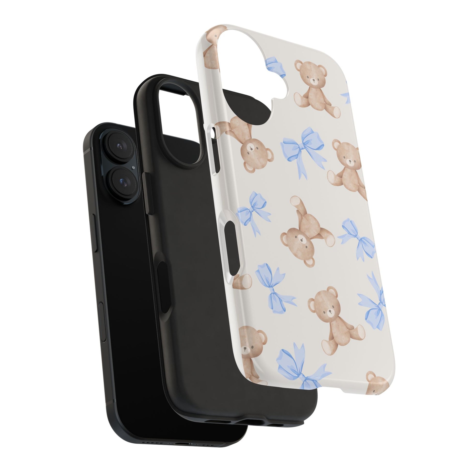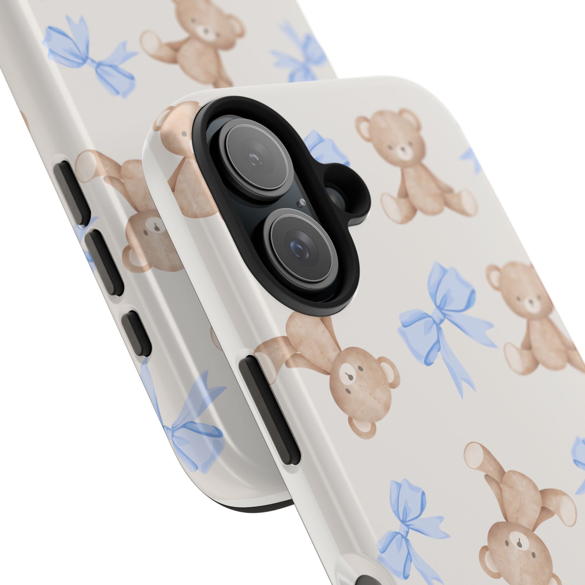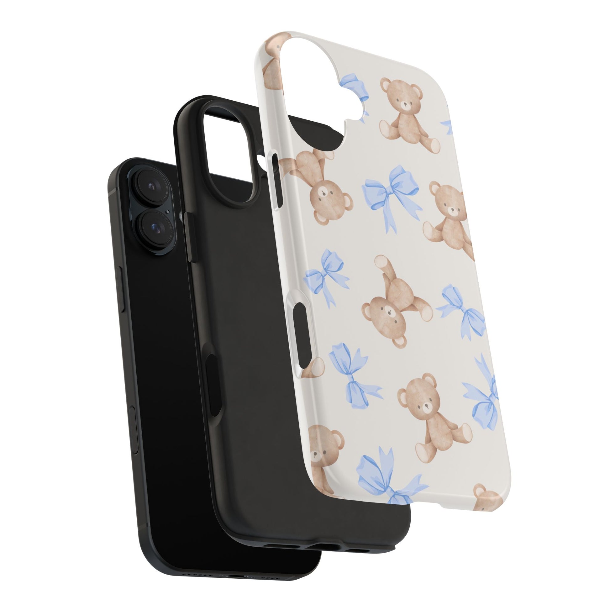 A playful, protective phone case that brings a soft, nostalgic touch to everyday carry. Tiny teddy bears with delicate blue bows parade across a glossy background, turning a practical protective shell into a small keepsake you’ll see every time you reach for your phone. The two-piece construction — a tough polycarbonate outer shell and a flexible TPU inner liner — absorbs shocks and disperses impacts, while the raised bezel helps keep the screen safe from scratches when laid face-down. The glossy, UV-protected finish keeps colors bright over time so the pastel blues and warm browns stay cheerful. It supports wireless charging and fits modern phone models, including the newest iPhone 17 series, so protection and sweet style go hand in hand.