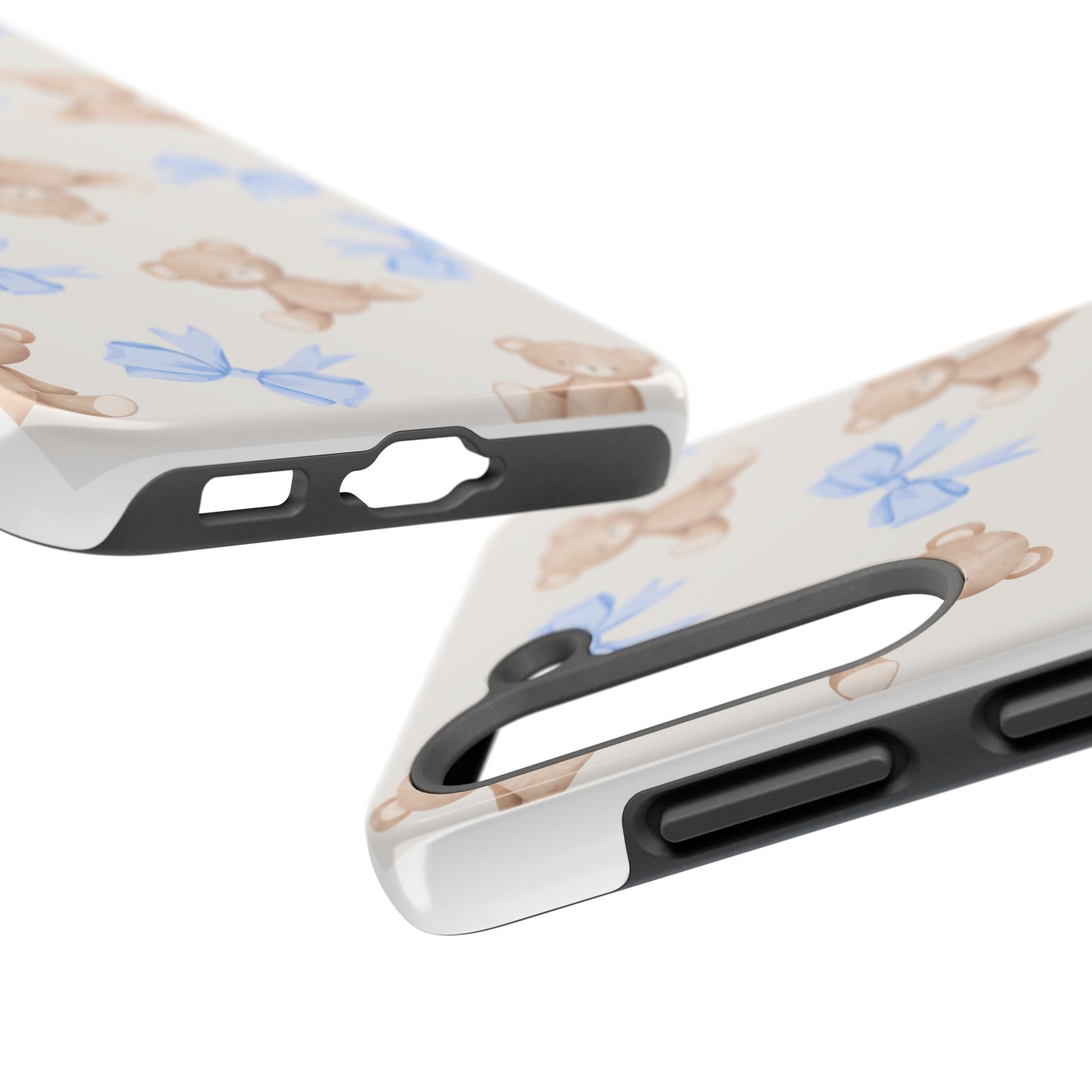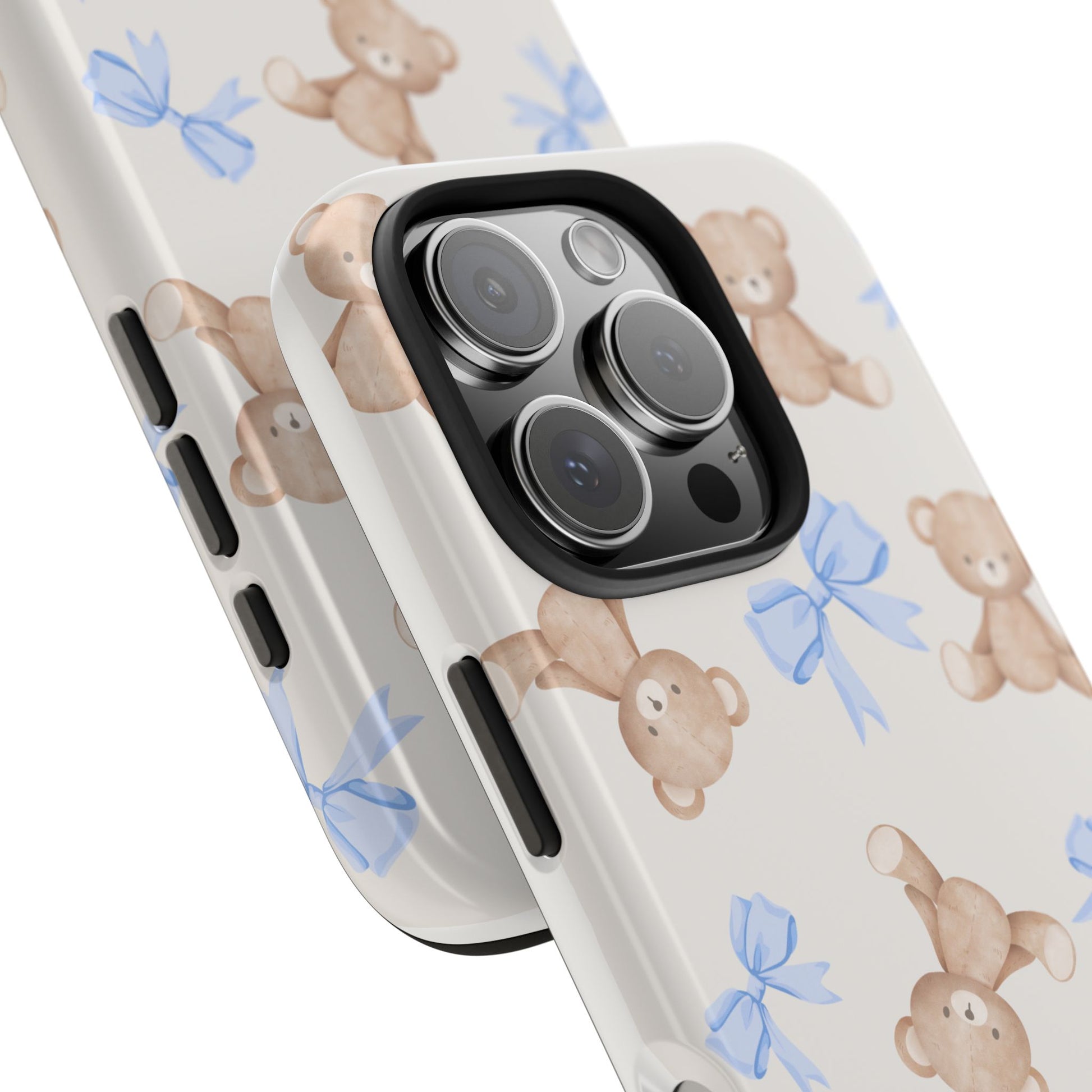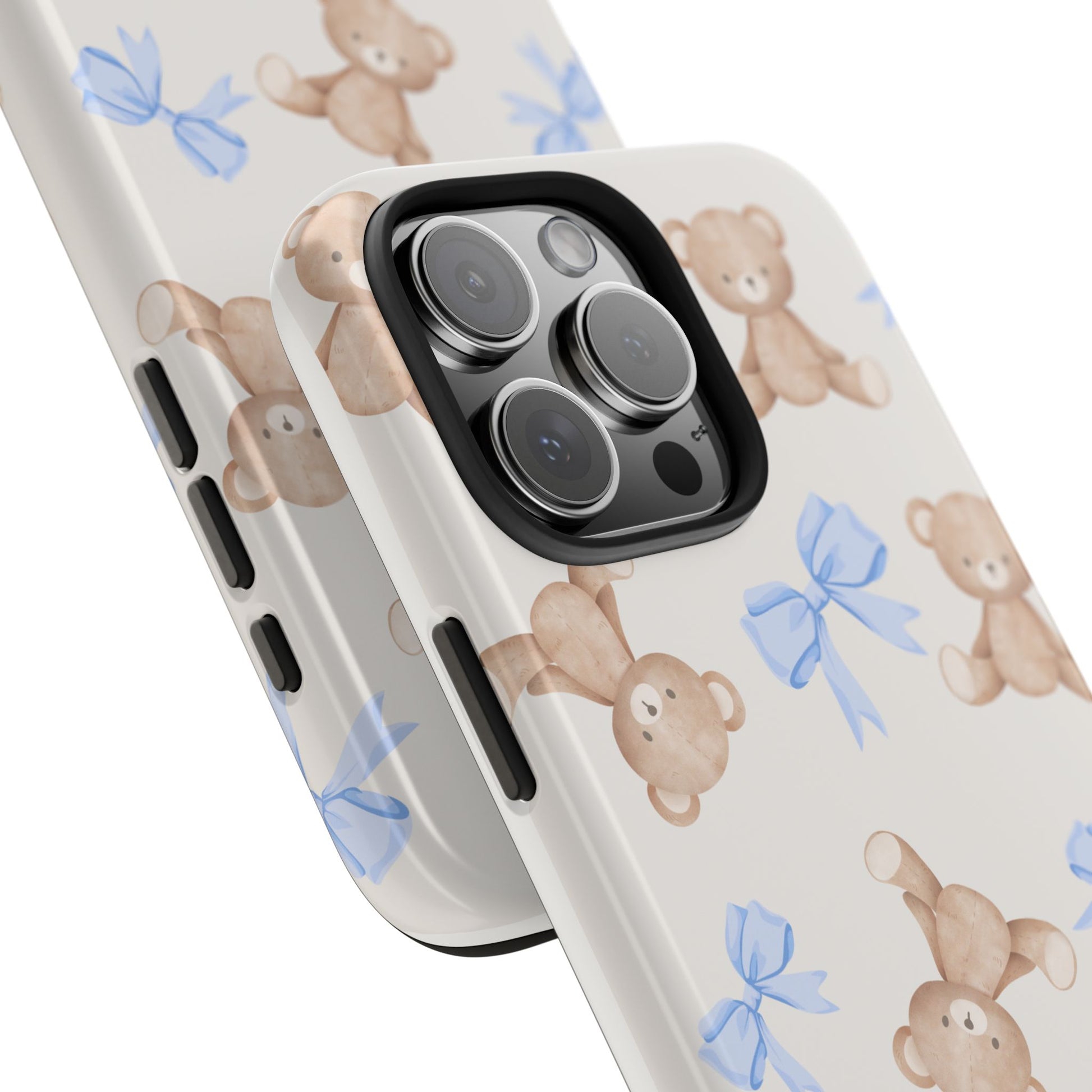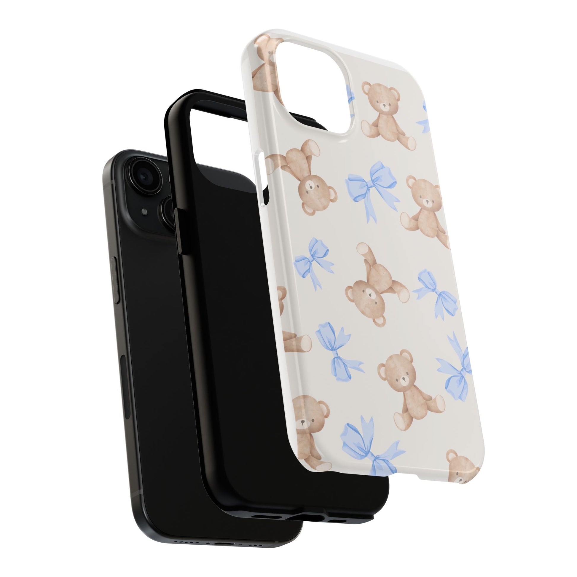 A playful, protective phone case that brings a soft, nostalgic touch to everyday carry. Tiny teddy bears with delicate blue bows parade across a glossy background, turning a practical protective shell into a small keepsake you’ll see every time you reach for your phone. The two-piece construction — a tough polycarbonate outer shell and a flexible TPU inner liner — absorbs shocks and disperses impacts, while the raised bezel helps keep the screen safe from scratches when laid face-down. The glossy, UV-protected finish keeps colors bright over time so the pastel blues and warm browns stay cheerful. It supports wireless charging and fits modern phone models, including the newest iPhone 17 series, so protection and sweet style go hand in hand.