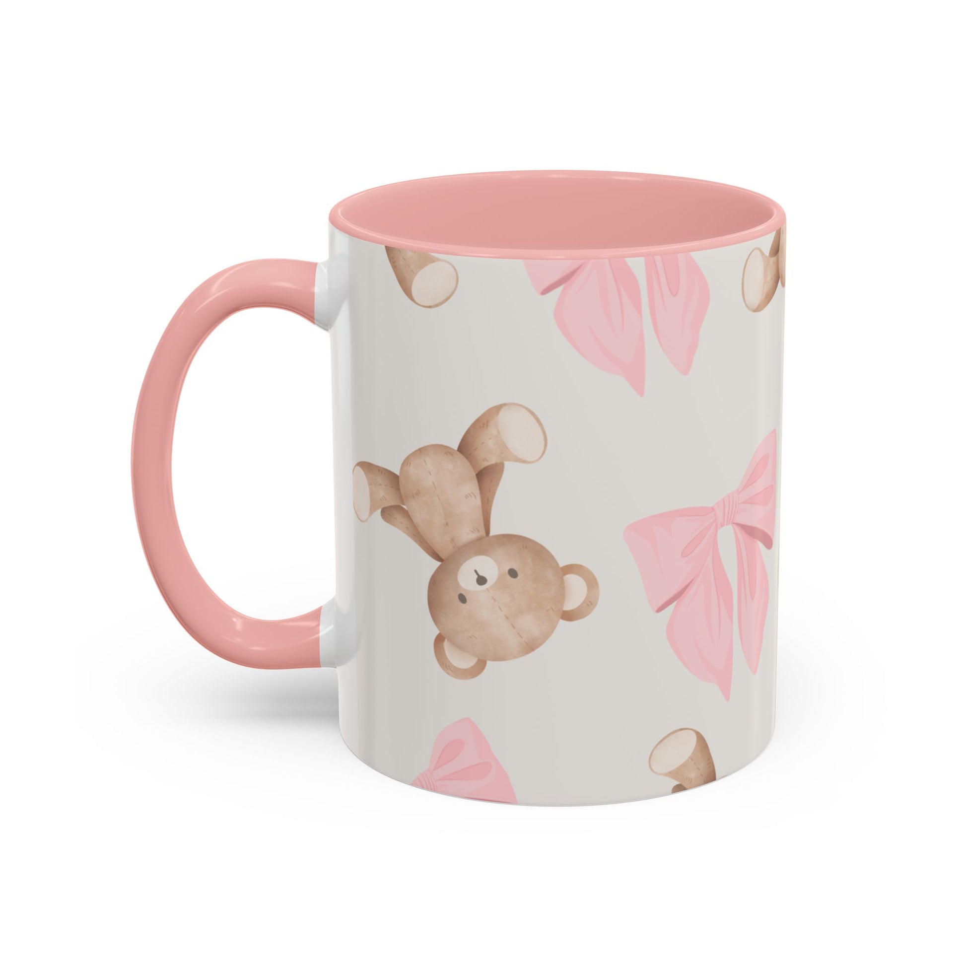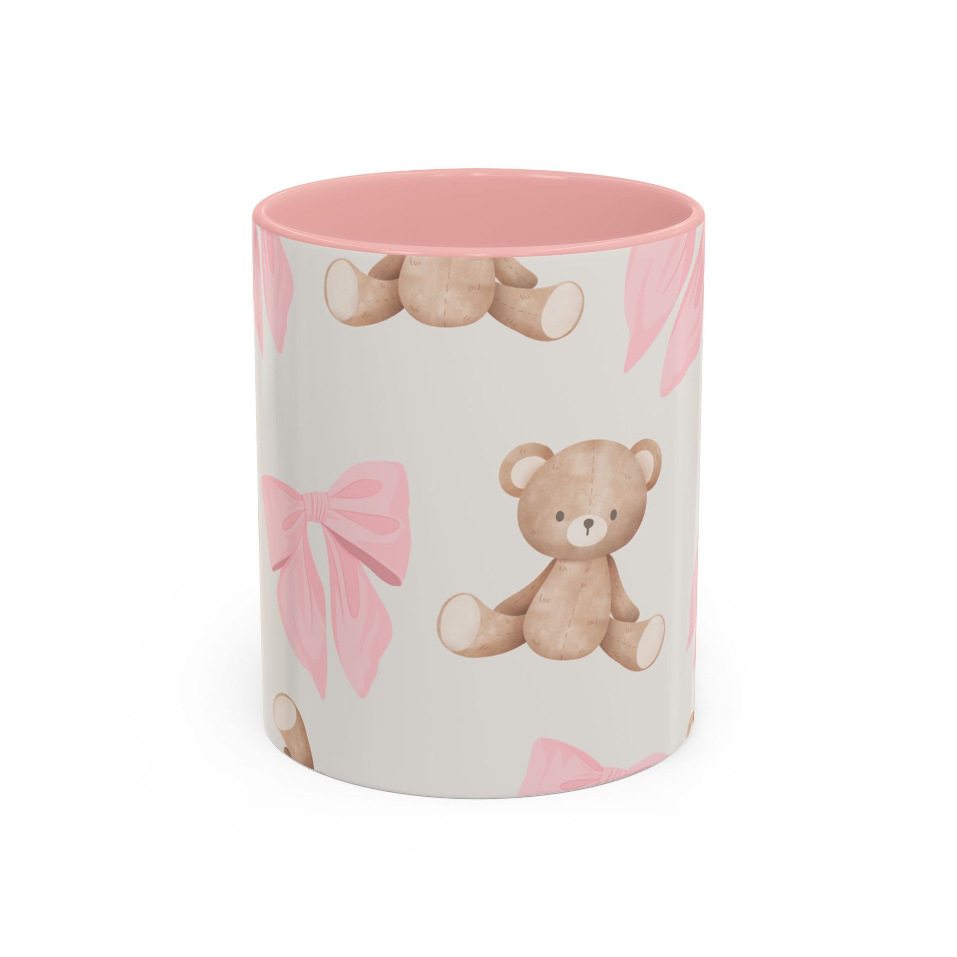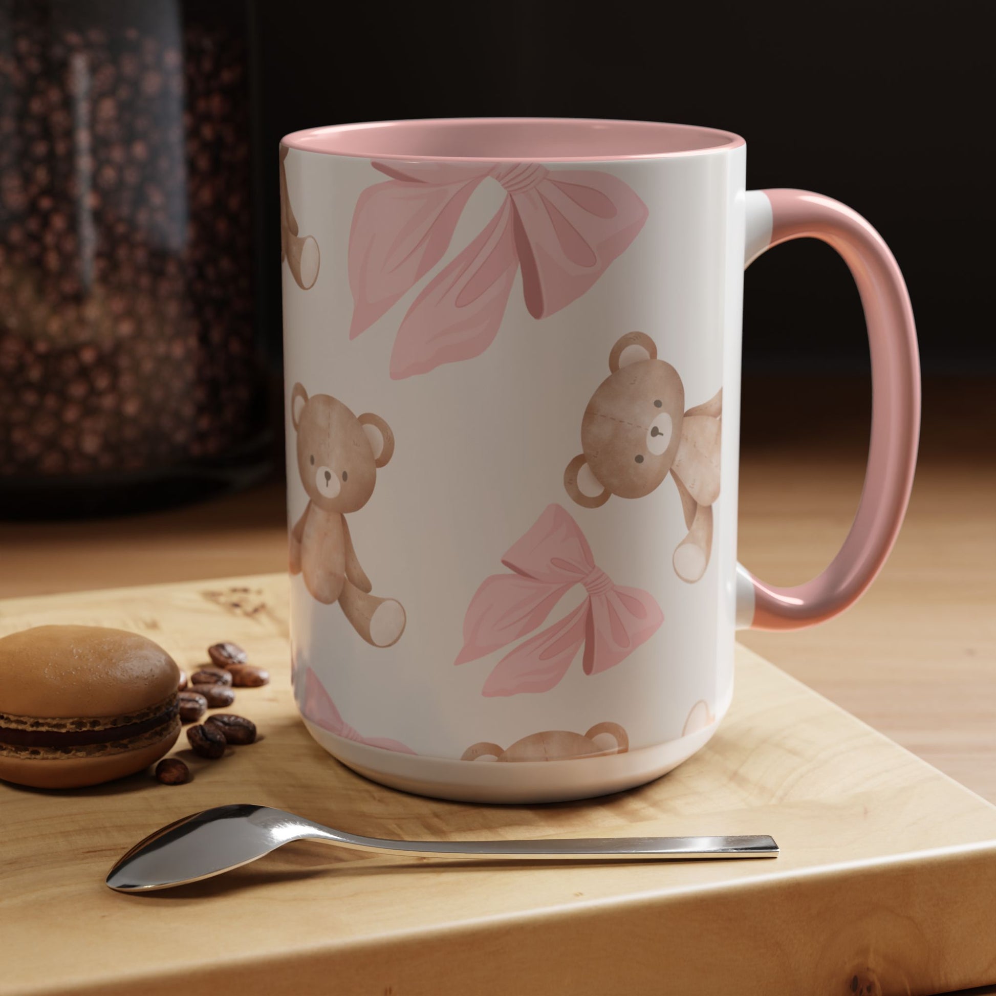 Teddy Bear Pink Bow Accent Coffee Mug — Cute 11/15oz Ceramic Mug with Pink Interior