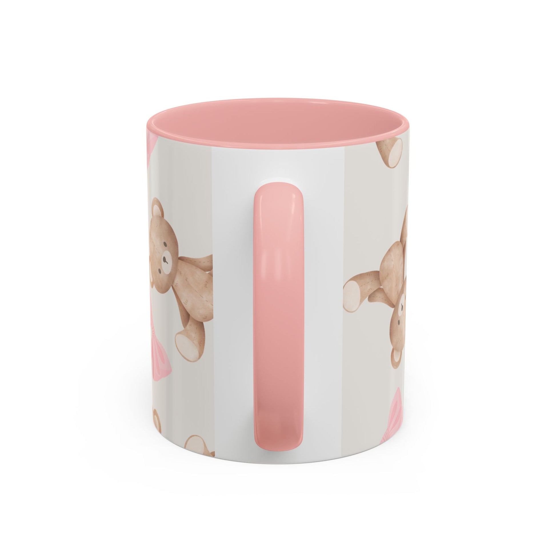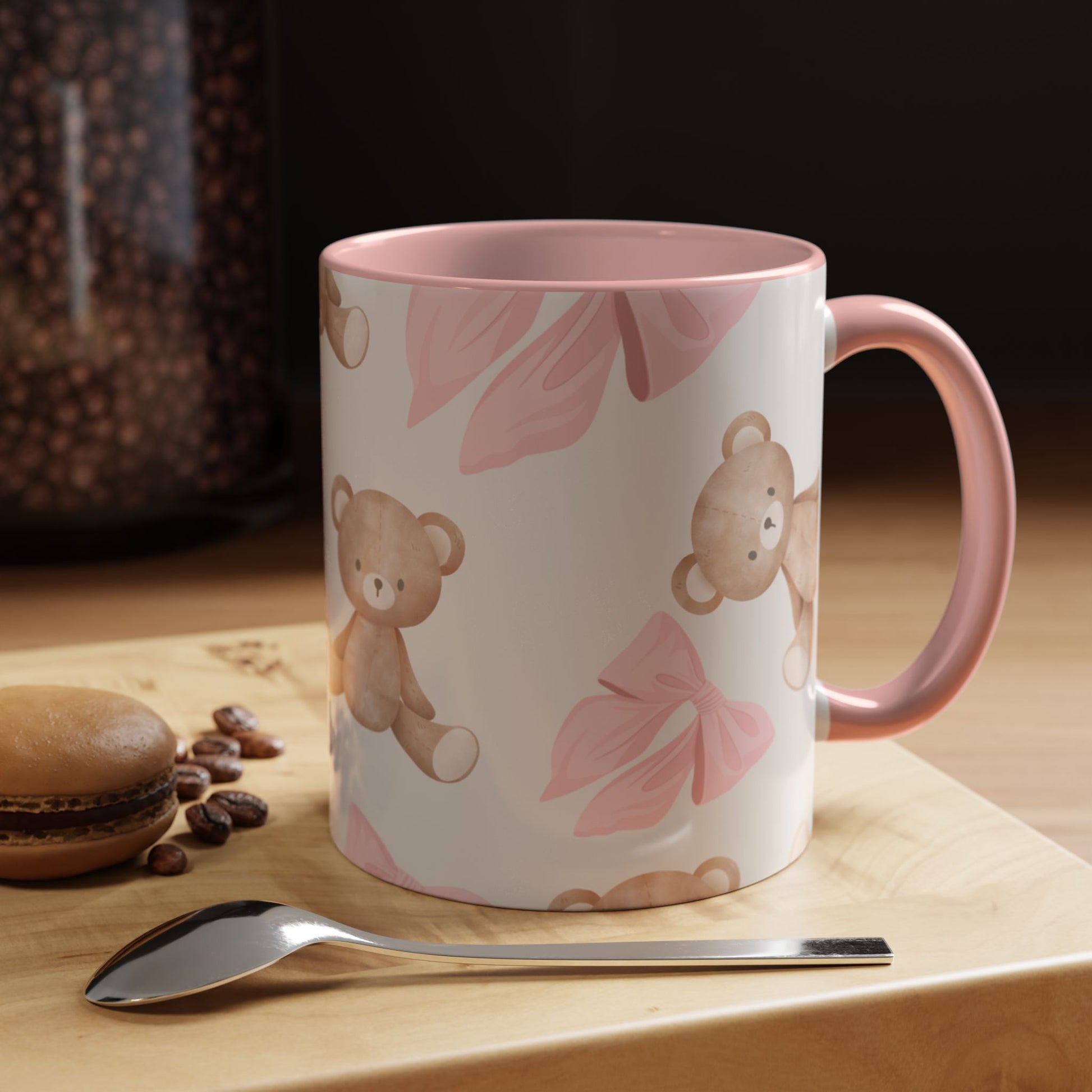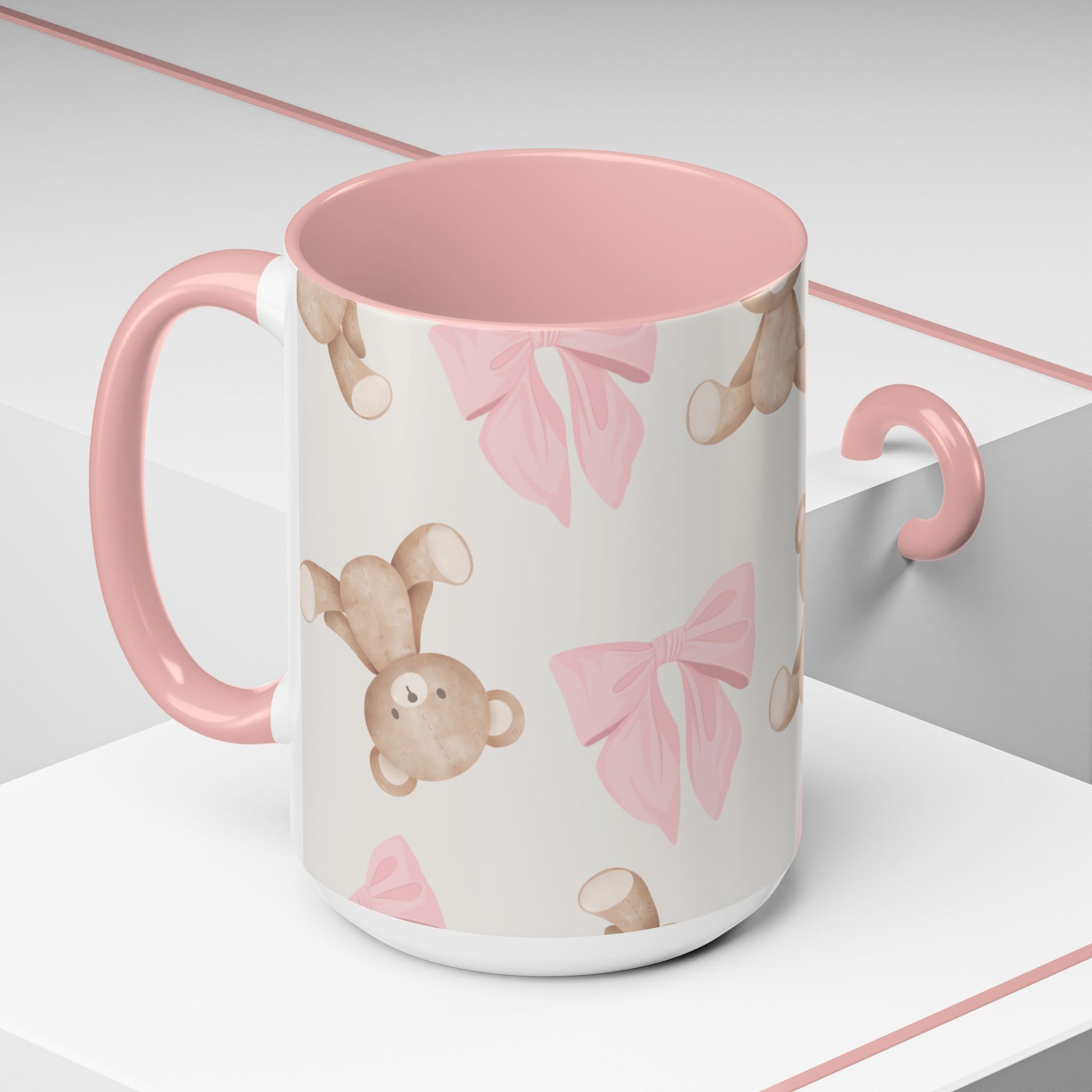 Teddy Bear Pink Bow Accent Coffee Mug — Cute 11/15oz Ceramic Mug with Pink Interior